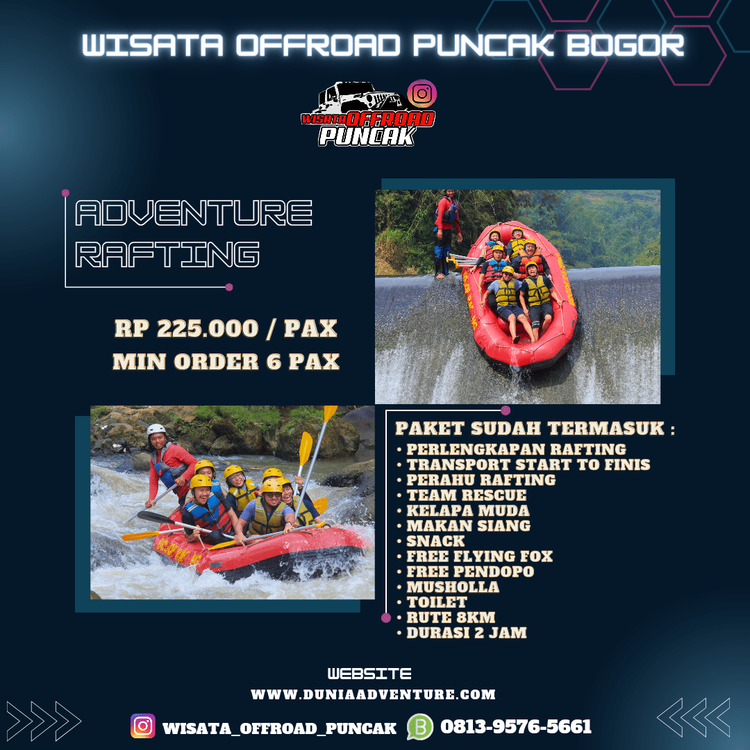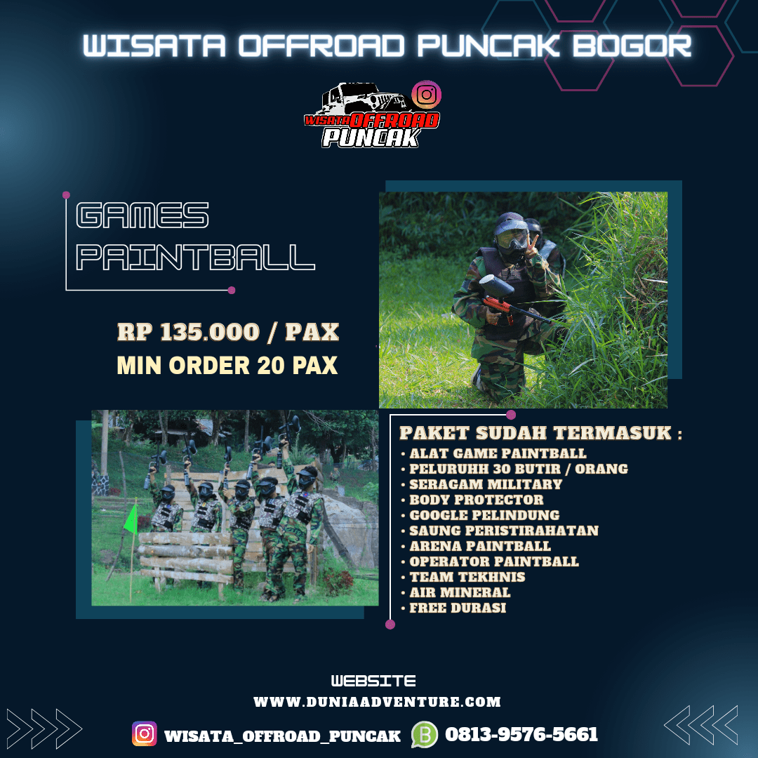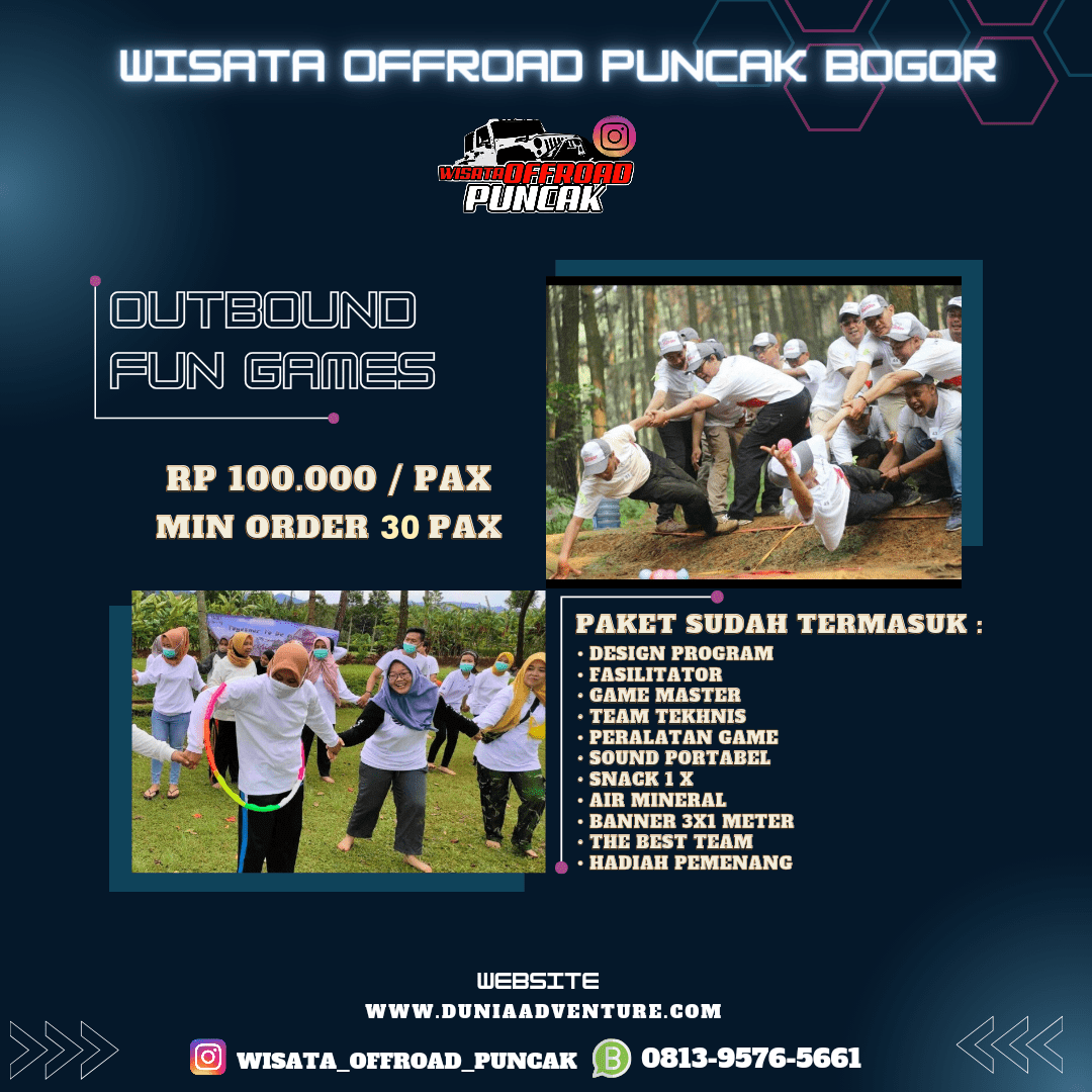 Dunia Adventure menawarkan paket outbound termurah dengan beragam pilihan wisata dan fun game yang menantang serta wajib Anda coba untuk menoreh pengalaman liburan yang lebih menyenangkan seperti offroad, paintball, rafting, dan aneka fun game lainnya. Kami menawarkan fasilitas terbaik dan pelayanan memuaskan, menjadi pilihan tepat untuk agen tour Anda saat di Puncak Bogor. Yuk liburan sekarang!